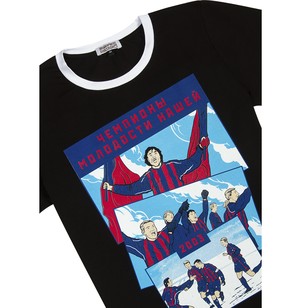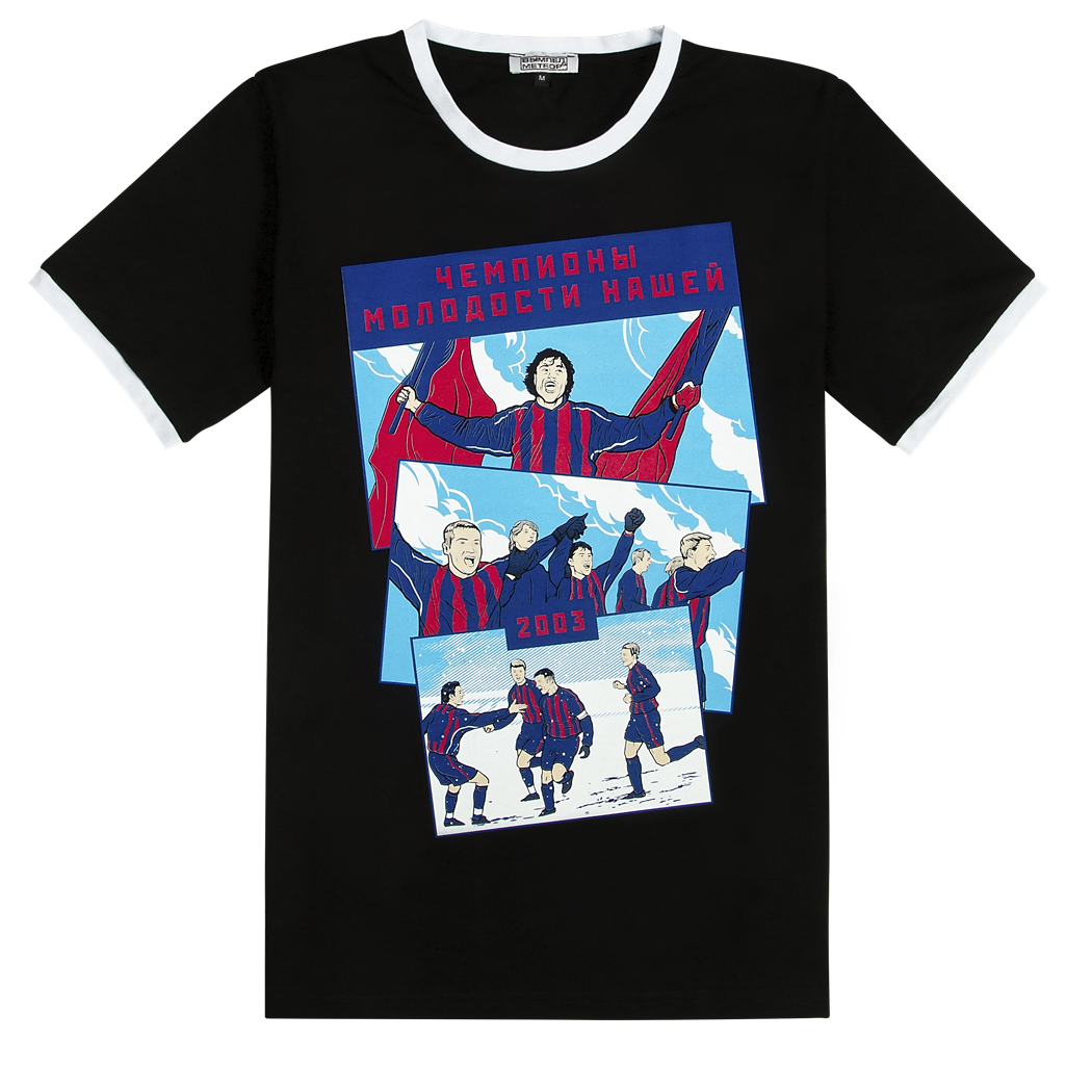 Футболка посвящена первому в новейшей истории титулу ЦСКА. Рисунок выполнен в стиле стопки фотографий и каждый болельщик красно-синих, который помнит 2001-2002 годы, узнает событие и игроков на футболке.