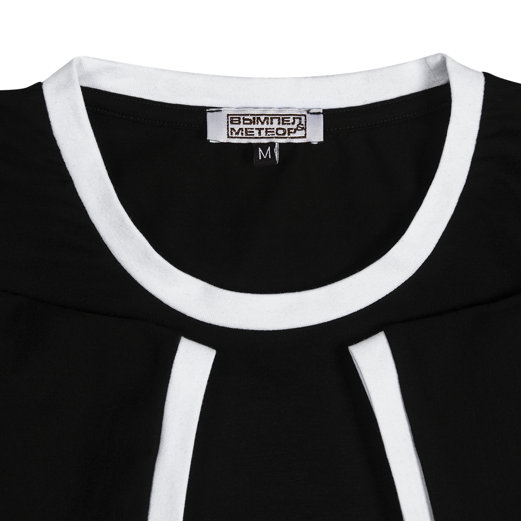 Чёрная футболка с белой окантовкой воротника и манжет рукавов сшита из лёгкой турецкой ткани плотностью 180-185 гр/м2. Материал: хлопок 95% + лайкра 5%.