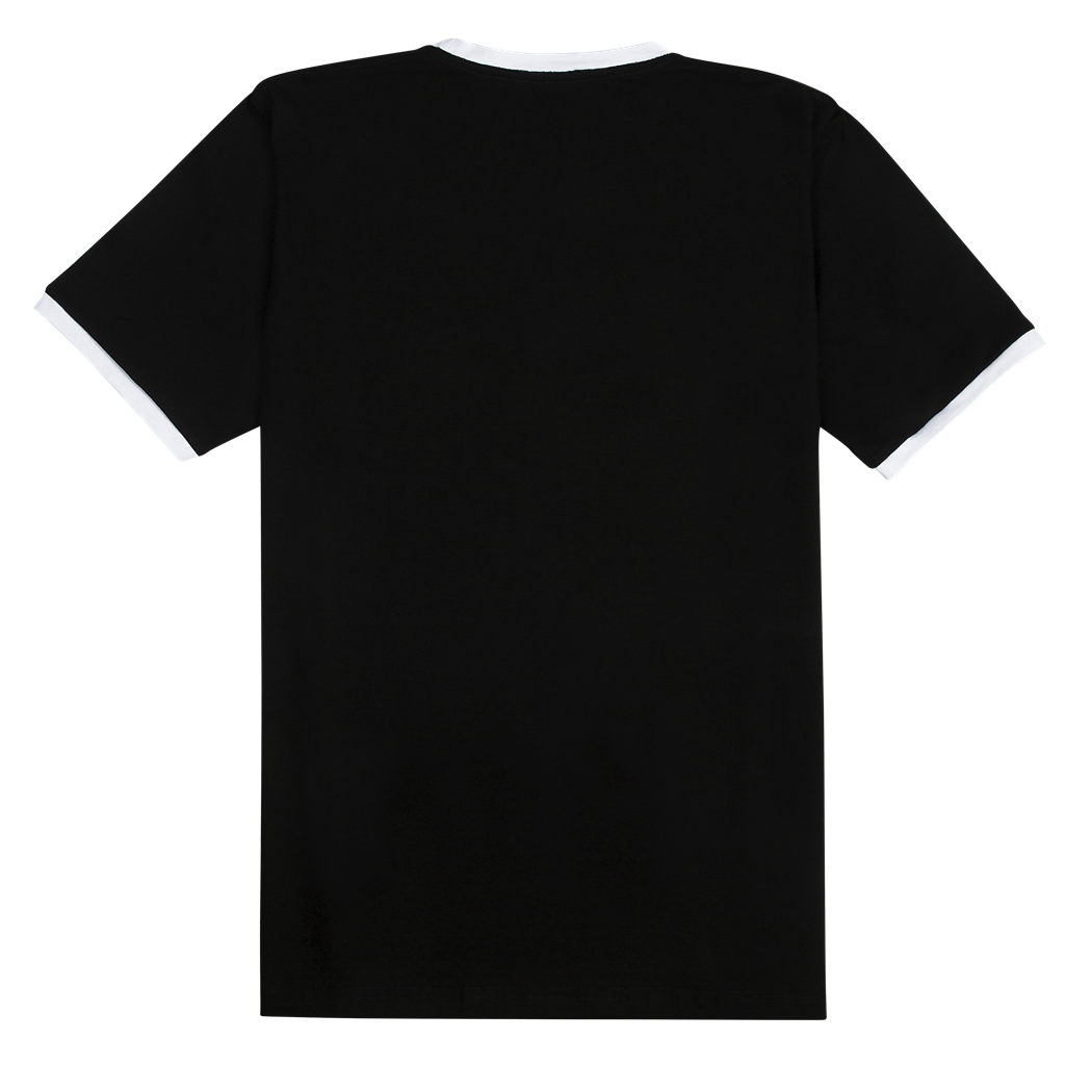 Чёрная футболка с белой окантовкой воротника и манжет рукавов сшита из лёгкой турецкой ткани плотностью 180-185 гр/м2. Материал: хлопок 95% + лайкра 5%.