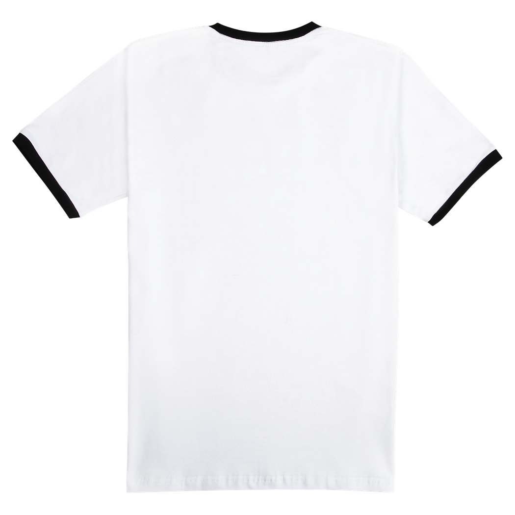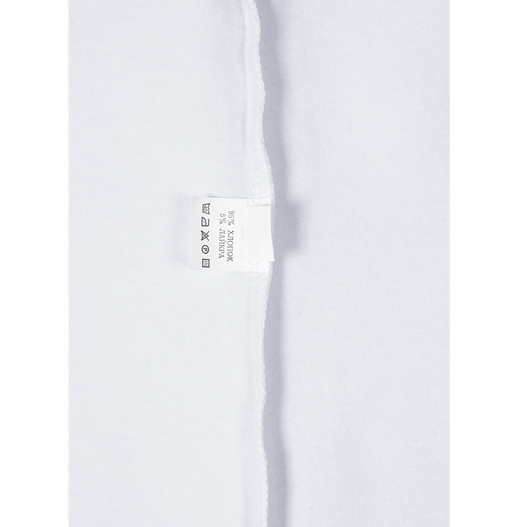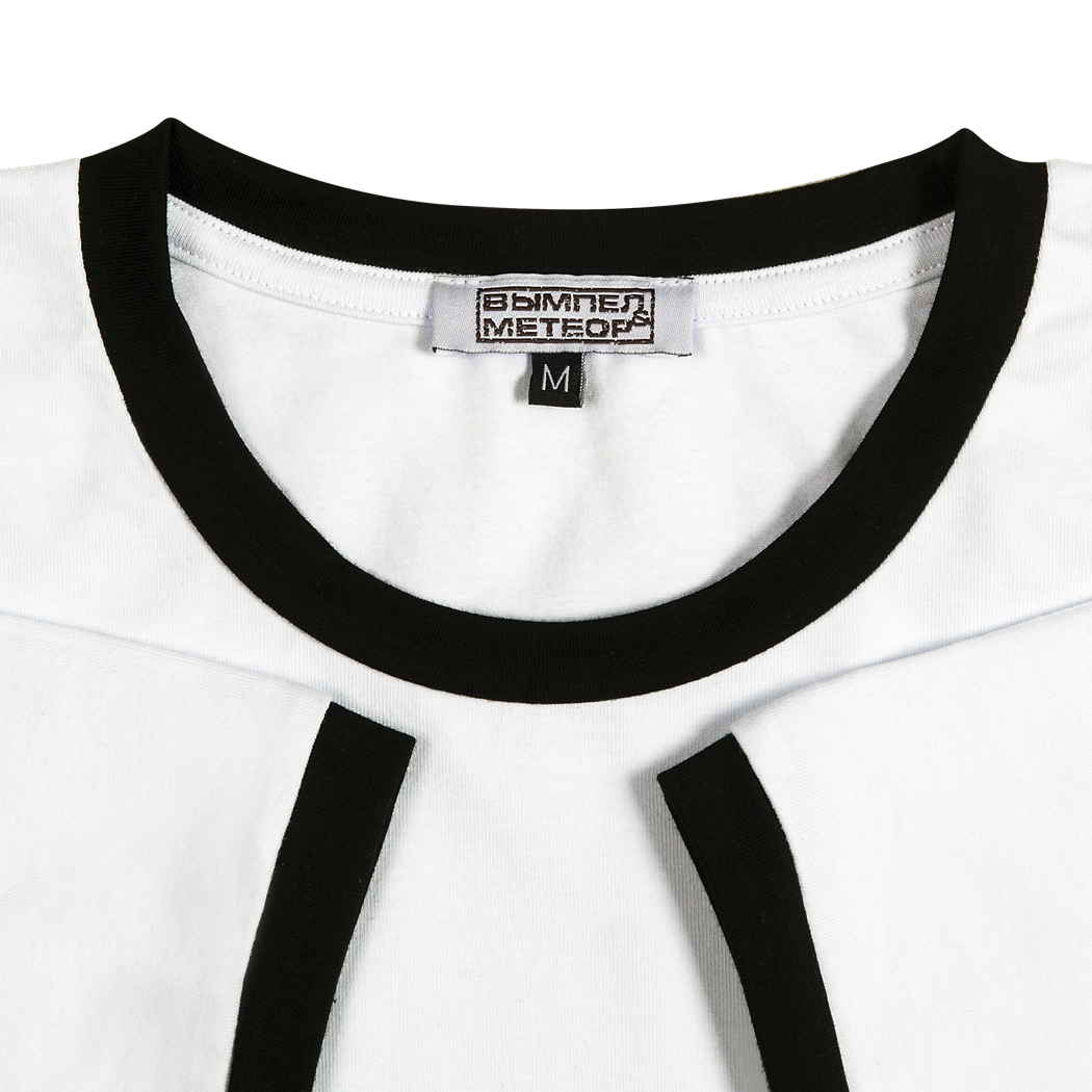 Белая футболка с чёрной окантовкой воротника и манжет рукавов сшита из лёгкой турецкой ткани плотностью 180-185 гр/м2. Материал: хлопок 95% + лайкра 5%.