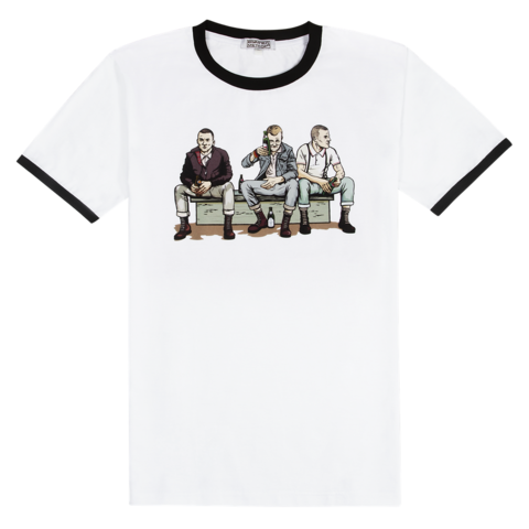 The T-shirt depicts beer-drinking skinheads dressed in classic 70s and 80s fashion.